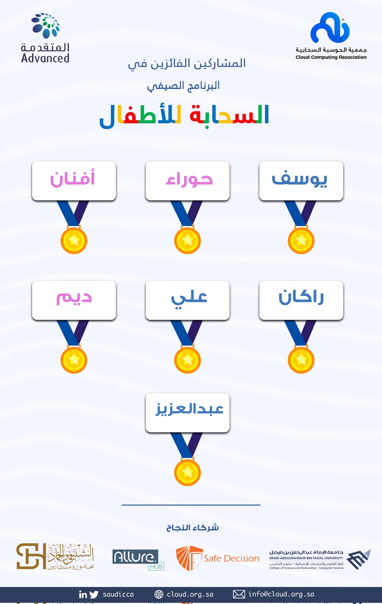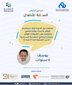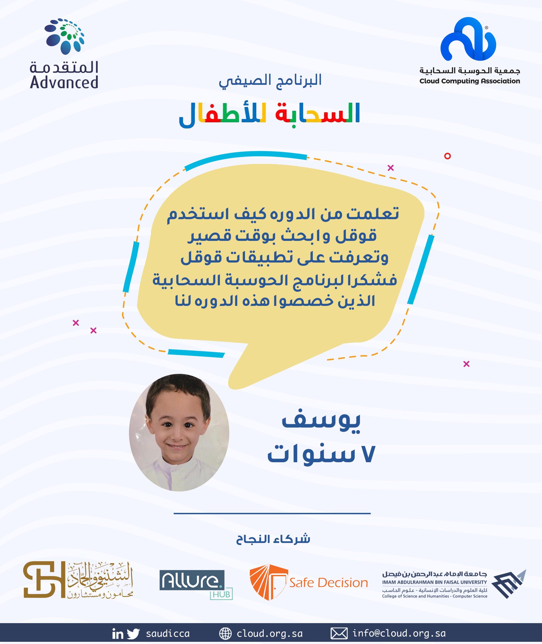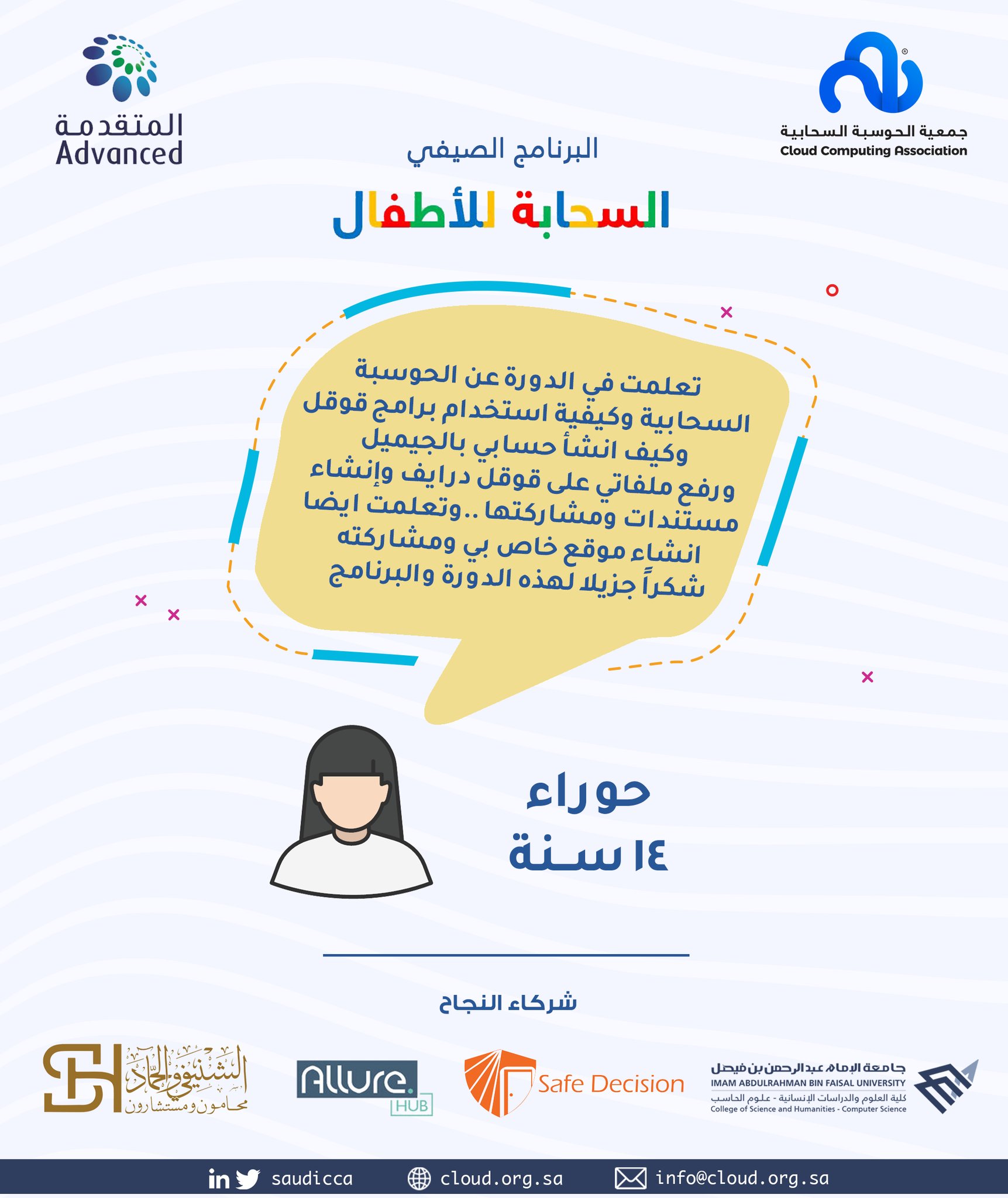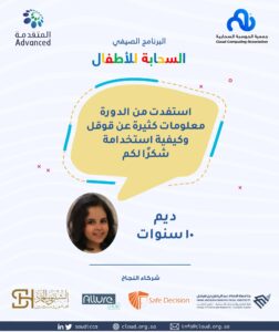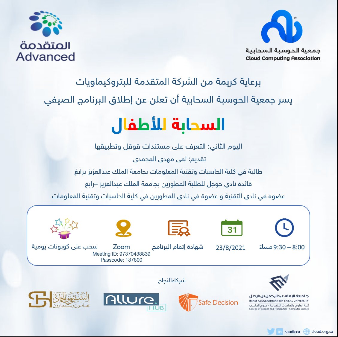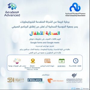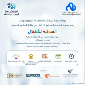 برعاية كريمة من الشركة المتقدمة للبتروكيماويات، عقدت جمعية الحوسبة السحابية البرنامج الصيفي (السحابة للأطفال) والذي تم فيه عمل مجموعة من الورش موجهة للأطفال لتعريفهم بكيفية استخدام أنظمة شركة Google وذلك على مدى أربعة أيام ابتداء من الأحد الموافق 22 أغسطس وحتى الاربعاء الموافق 25 أغسطس.