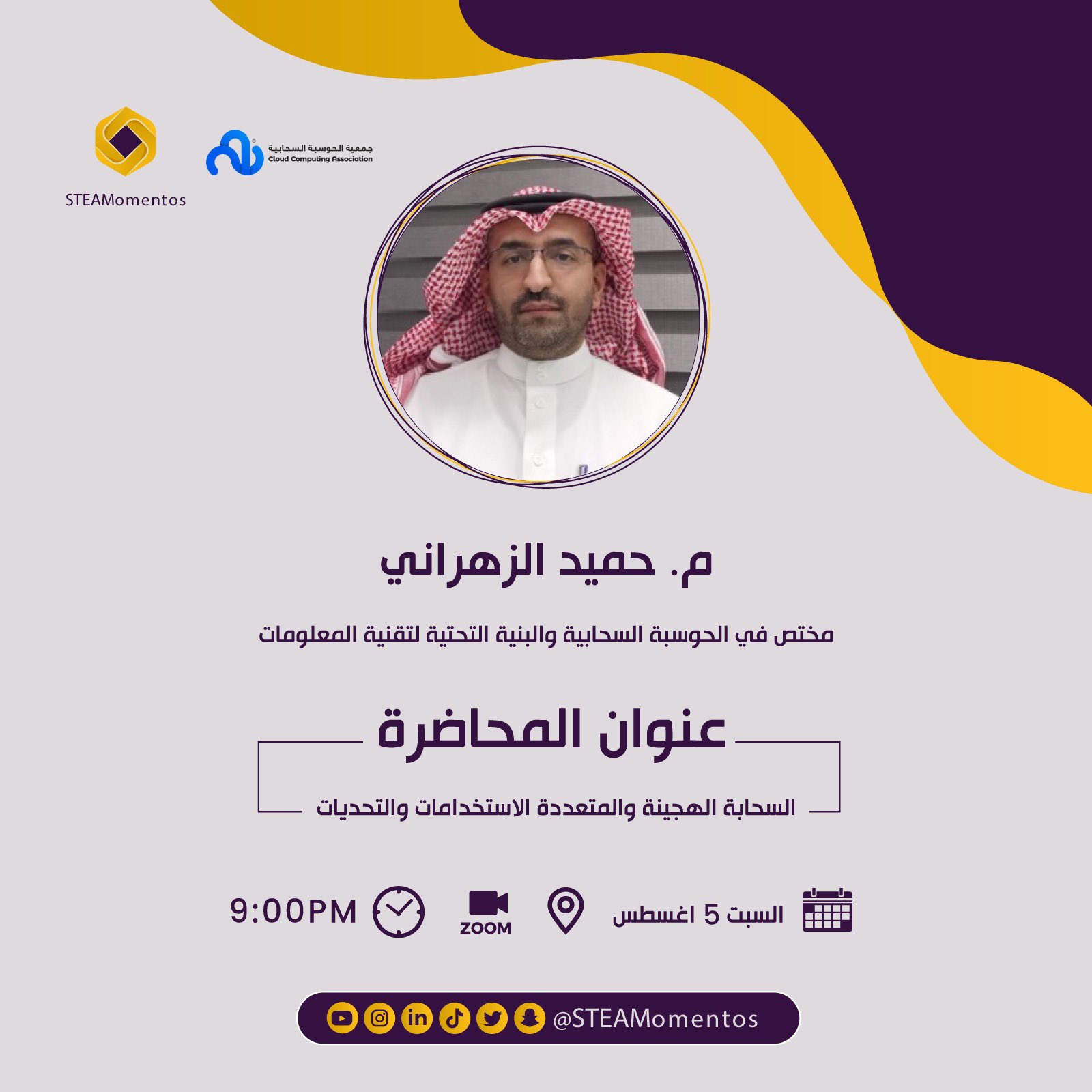 - محاضرة بعنوان السحابة الهجينة والمتعددة الاستخدامات والتحديات – تقديم م. حميد الزهراني.